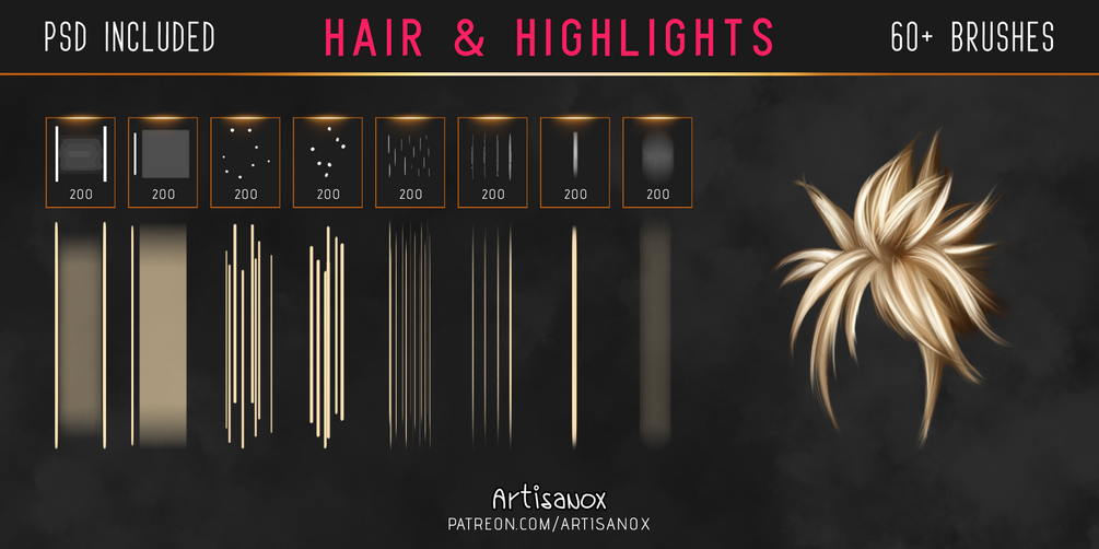 A large variety of over 60+ brushes that I utilize when creating hair. I created these based on what types of strokes I use that I may do repetitively, or certain brushes which make life just a little bit easier. If I come up with anything new that I find useful, I'll update the package.